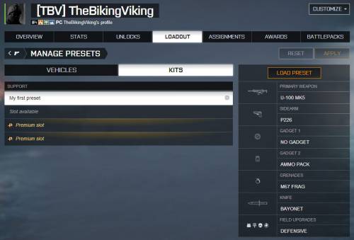 Всего у игрока будет возможность настроить 2 предустановки, для класса и техники. Игроки Battlefield 4 Премиум получат возможность сохранить 4 предустановки. Имя выбранной предустановки будет отображаться отображаться на месте названия класса или техники.