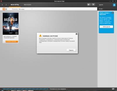 Проблема: При установке Origin с диска Battlefield 3, просит зайти на сайт и скачать новую версию клиента. Решение: Следуйте инструкциям. На диске старая версия Origin, которую необходимо обновить.