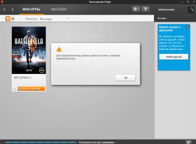 | Привет всем!Может кто подскажет решение проблемы с установкой BF3 через Origin.Просит войти в систему под учёткой админа.А я тогда кто ?Первый раз с такой х-нёй сталкиваюсь.(У меня Win7).Кто сталкивался -подскажите!