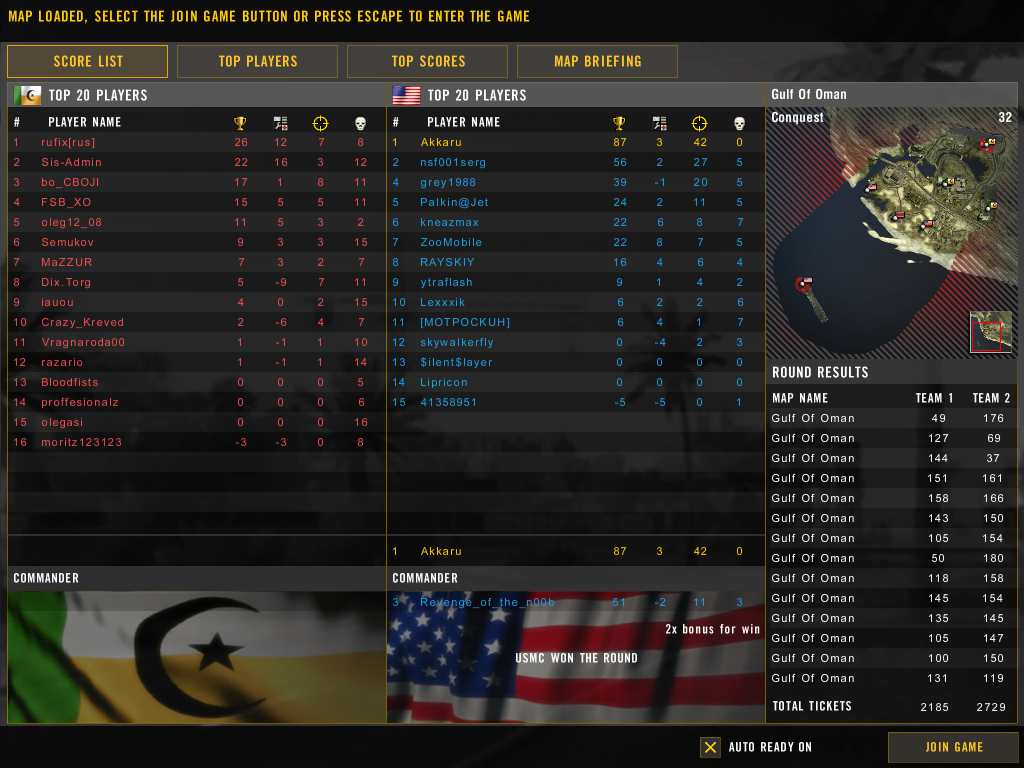 | Мы сёдня с Самураем поваевали - ууух - они с Пацифистом на вертолёте - я на земле (антитанк)хороший такой раунд был - они меня с верта мочили - я пытался выжить и завалить их - и сегодня тот день когда я стал лучше играть Антитанком - и самое главное ,что я никогда не придовал значения наземной антитехникой - тоесть TOW - вообще вещь стоющая !!!