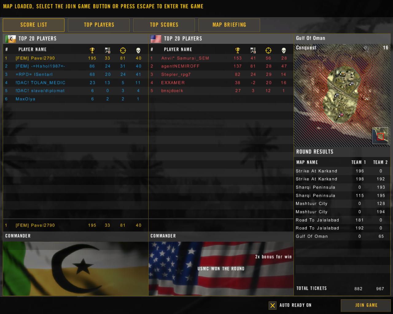 | Я сегодня играл на Омане, а остальные карты сын играл. Меня на заливе поразило желание опытных игроков играть за одну сторону. Разве так интересно? Новичков крошить. У нас авиация отсутствовала как таковая, хорошо еще наши самолеты не угнали. Хотя одно время у них и два верта было, "Игла" им в фюзеляж . Это же самый кайф когда встречаешься лицом к лицу с Маснетом или еще каки-либо сильным игроком. Ради этих мгновений и стоит играть в БФ2. Хотя молодеж и сама от части виновата. Я когда зашел на сервер все точки были захваченны, а несколько человек сидели на НЗБ МЕС и пытались бейсрейпить- красавчики. У вас все точки отхватили, а они на вражеской НЗБ околачиваются. Но потом совместными усилиями ситуацию маленько исправили и поиграли не с разгромным счетом. Вот только безнаказанный бомбандировщик доставал постоянно. Один раз с "Иглы" удалось его прищучить, но разве с Семаковам в небе спокойно посидишь за ПВО. Давайте не выбирать сильную сторону, а пытаться просто играть и получать удовольствие от игры. Я ни кого не обвиняю, возможно действительно так случайно получилось. До встречи на полях сражений
