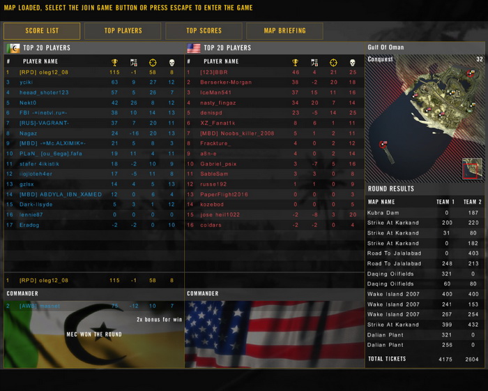 | Предлагаю открыть импровизированный клуб "Почетный сотник". Кто в него будет входить? Все кто набирал в battlefield 2 за один раунд больше 100 очков. Согласитесь- это гроссмейстерский результат. Для вступления в клуб необходимо описать раунд в котором Вы набрали очки, если таких много, то выбираете любой. После этого Вы будете занесены в список клуба. Все участники клуба автоматически награждаются орденом "Кровавой Звезды". Список награжденных орденом "Кровавой Звезды". 1. Anvil*SMOKEingKUB 2. Anvil*Palkin@Jet 3. Anvil*Akkaru -трижды орденоносец 4. =RPD=mindfacker 5. Semukov 6. [FEM]-=Hahol1987=- 7. [FEM]bober_foreve 8. Anvil*oleg12_08 9. [RPD]Dimkas787 10.[FEM]arsDeL 11.[Anvil*]MAX_512ck 12.[FEM]Pavel2790 13.IIIAVIII 14.EviL_3Jlou 15.fafa 15.Semukov 16.Silvestri 17.Anvil*Samurai_SEM 18.-=ALCHUP=- 19.kalbaster 20.JOKERFLASH 21.Mr_GROZNY 22.=RPD=|Sentar| 23.[FEM]Panamkin 24.[FEM]bush