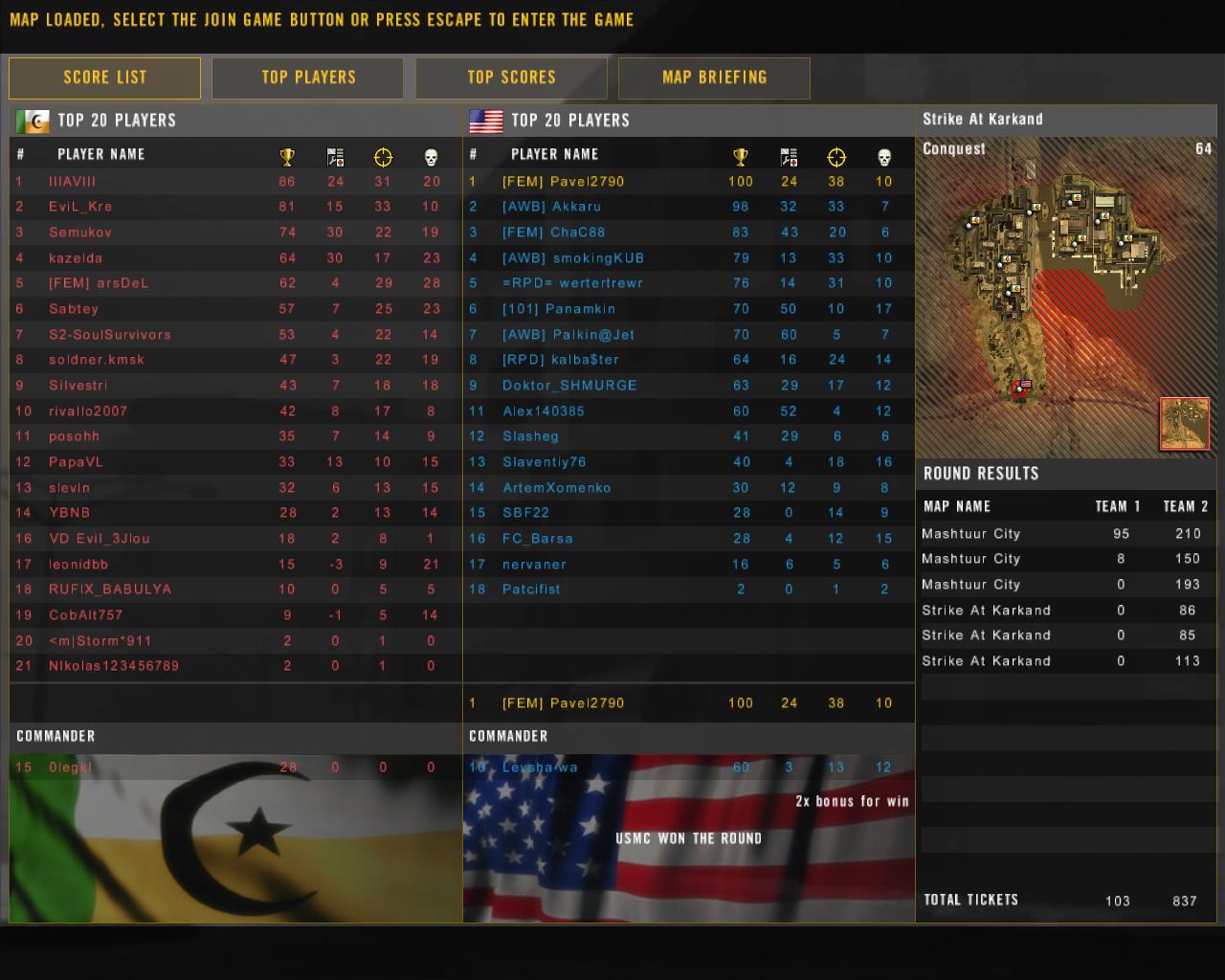 | Предлагаю открыть импровизированный клуб "Почетный сотник". Кто в него будет входить? Все кто набирал в battlefield 2 за один раунд больше 100 очков. Согласитесь- это гроссмейстерский результат. Для вступления в клуб необходимо описать раунд в котором Вы набрали очки, если таких много, то выбираете любой. После этого Вы будете занесены в список клуба. Все участники клуба автоматически награждаются орденом "Кровавой Звезды". Список награжденных орденом "Кровавой Звезды". 1. Anvil*SMOKEingKUB 2. Anvil*Palkin@Jet 3. Anvil*Akkaru -трижды орденоносец 4. =RPD=mindfacker 5. Semukov 6. [FEM]-=Hahol1987=- 7. [FEM]bober_foreve 8. Anvil*oleg12_08 9. [RPD]Dimkas787 10.[FEM]arsDeL 11.[Anvil*]MAX_512ck 12.[FEM]Pavel2790 13.IIIAVIII 14.EviL_3Jlou 15.fafa 15.Semukov 16.Silvestri 17.Anvil*Samurai_SEM 18.-=ALCHUP=- 19.kalbaster 20.JOKERFLASH 21.Mr_GROZNY 22.=RPD=|Sentar| 23.[FEM]Panamkin 24.[FEM]bush