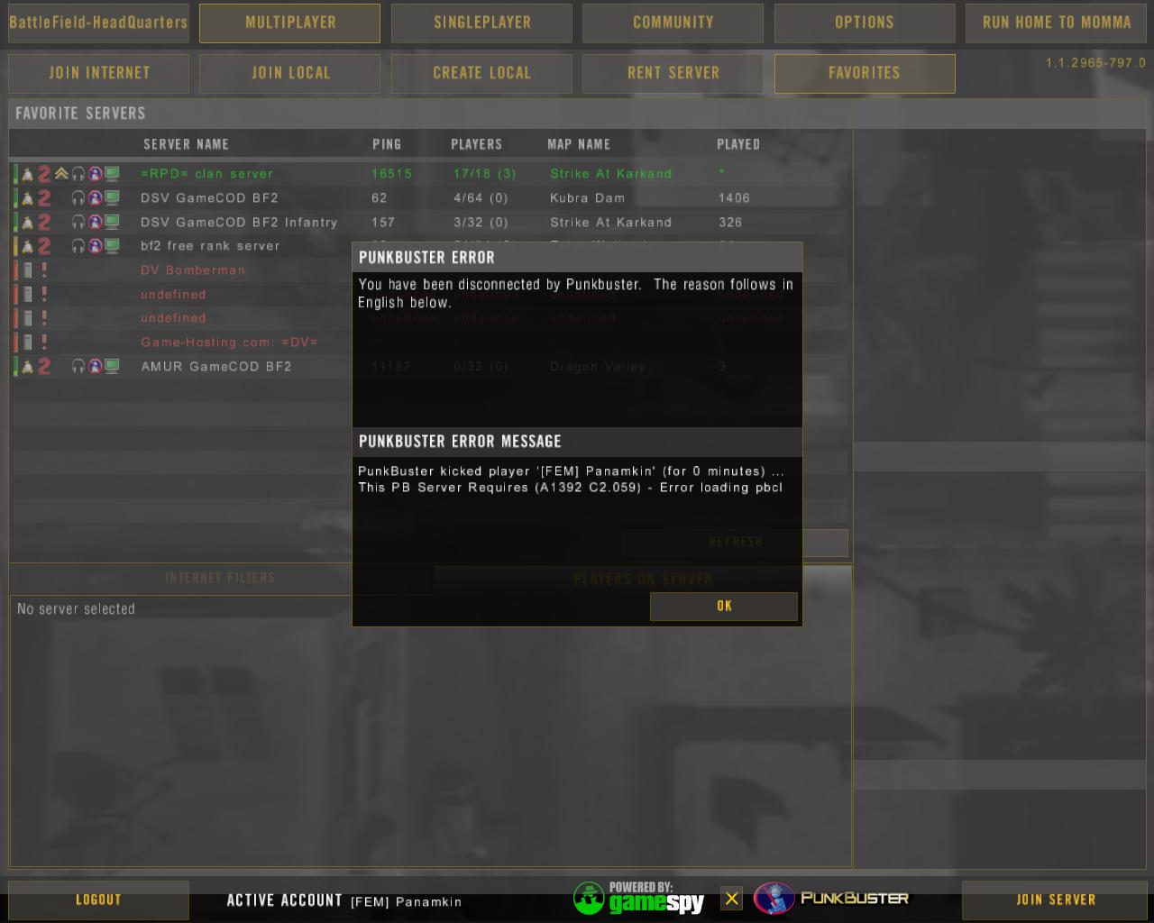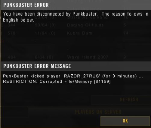 Punkbuster kicked player ... (for 0 minut) ......... Failure: PnkBstrb.exe initializating failed
