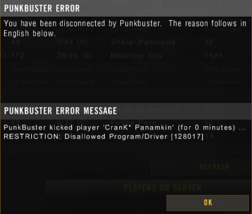 Punkbuster kicked player ... (for 0 minut) ......... Failure: PnkBstrb.exe initializating failed