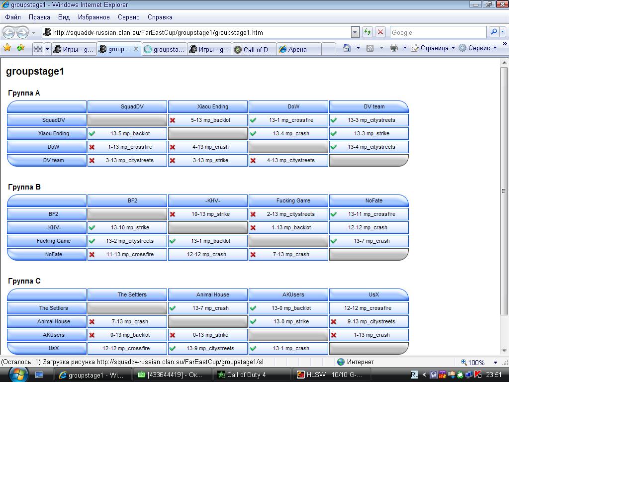Ну вот и закончился Call of Duty 4 Far East NightCup. Даже грустно немного. Как вы наверно знаете от нашего комьюнити выступала команда- bf2. Выступили они на мой взгляд достойно, ну не вышли во второй групповой этап, с кем не бывает. Тем более играли они в этом составе первый раз. Ну и еще маленькое оправдание, играли они вчетвером против команд с пятью участниками. Первый блин комом не получился. Все нормально, получен неоценимый опыт, который на паблике не приобретается, а приходит только как раз через участие в подобных турнирах. Полную информацию по NightCup я думаю вы все знаете где найти, поэтому приводить количество коман и их состав я не буду. Выложу только итоговую таблицу первого группового этапа.