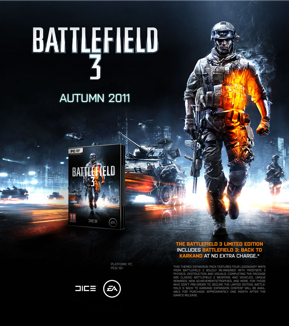 В Battlefield 3, игроки будут воевать на стороне элиты морской пехоты США, как в одиночной одиночном так в в многопользовательском режиме. Вам предстоит воевать по всему миру, включая Париж, Тегеран и Нью-Йорк. Frostbite 2 обеспечит в Battlefield 3 превосходное качество изображения, большое чувство масштаба, массовые разрушения, динамический звук и невероятно реалистичные анимации персонажа. Перетащите павших товарищей в безопасное место и установи свое оружие практически на любой участок местности. Это что-то новое в серии, будет интересно узнать подробнее. Уникальная военная техника, от транспортных машин до современных боевых самолетов, ждет вас. Сражения будут происходить в странах Ближнего Востока, США и в Европе. Нас ждут как городские карты где за каждым углом вас подстерегает опасность, так и открытые карты, где во все свою мощь сможет показать военная техника. При покупке Battlefield 3 Limited Edition в качестве бонуса вы получаете расширение Battlefield 3: Back to Karkand, которое можно будет приобрести дополнительно спустя 1 месяц после выхода BF 3. Battlefield 3: Back to Karkand будет включать в себя: четырех легендарных карты из Battlefield 2 (одну можно назвать с уверенностью- Karkand), классические Battlefield 2 транспортные средства и оружие, уникальные награды, новые достижения/трофеи и многое другое.
