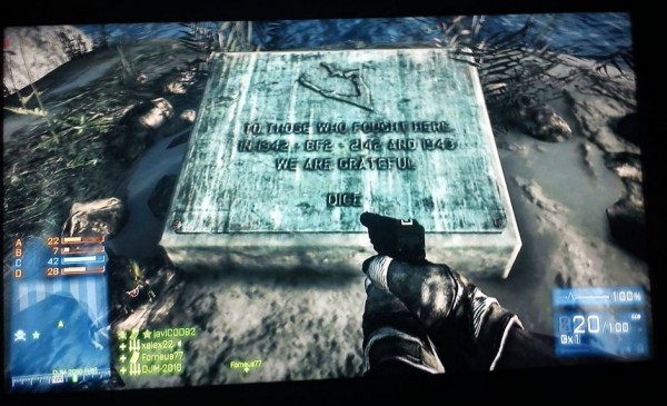 Первый секретом является "благодарственная плита", на которой выгравирована благодарственная надпись от DICE, разработчик франшизы Battlefield, всем ветеранам Battlefield движения, за поддержку серии. Второй секрет вы найдете на карте дополнения Wake Island. Игрушечный динозавр спрятан в где-то на территории острова. Сколько всего секретов оставили разработчики, пока неизвестно. Предлагаю после релиза Battlefield 3: Back to Karkand для ПК, выкладывать скриншоты найденных секретов.