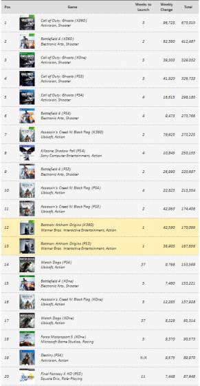 Портал BF4Central решил узнать реальное положение дел и провел собственное расследование, которое не претендует на истину в последней инстанции, но тем не менее дает хоть какую-то информацию по количеству предзаказов. Точное количество сделанных предзаказов Battlefield 4 порталу узнать конечно не удалось, а вот сравнить динамику предварительных заказов по сравнению с Battlefield 3, удалось узнать. Для этого было опрошено несколько менеджеров магазинов в Калифорнии и двумя менеджерами крупной розничной сети GameStop, в Лос-Анджелесе. Менеджеры магазинов сказали, что интерес к Battlefield 4 есть, но если проводить аналогию с Battlefield 3, то количество предзаказов на игру уменьшилось. Вторят им менеджеры из GameStop. Предварительные заказы упали по сравнению с BF3, а запросы и интерес покупателей к франшизе кажется пошел вниз. Любимый раздражитель EA- серия CoD, с их новым шутером Call of Duty Ghosts, распродается хорошо и уровни педзаказов остаются на высоком уровне, сравнимым с предыдущей игрой- Call of Duty Black Ops 2. Если прочитать аналитические статьи, то для консолей нового поколения Battlefield 4 скорее всего будет вне конкуренции и будет иметь самый большой успех на рынке. Хотя для EA это слабое утешение, доля копий Battlefield 4 для PS4 и Xbox One будет небольшой, от общего числа. Не будем забывать про Battlefield 4 Премиум, продажи которого стартовали относительно недавно и игроки пока не спешат его покупать до выхода игры и начала проведения различных акций для обладателей Премиум и выхода дополнений. Нашел информацию по количеству предзаказов в США для консолей нового и старого поколения на 19 октября. Превосходство Ghosts над BF4 очевидно, даже для консолей нового поколения.