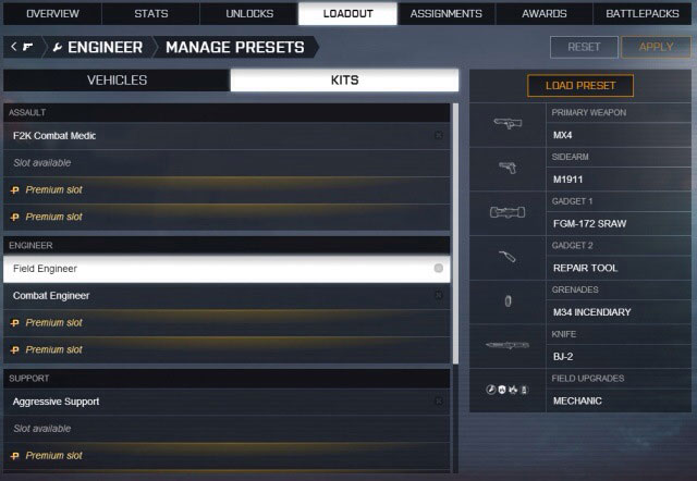 Всего у игрока будет возможность настроить 2 предустановки, для класса и техники. Игроки Battlefield 4 Премиум получат возможность сохранить 4 предустановки. Имя выбранной предустановки будет отображаться отображаться на месте названия класса или техники.
