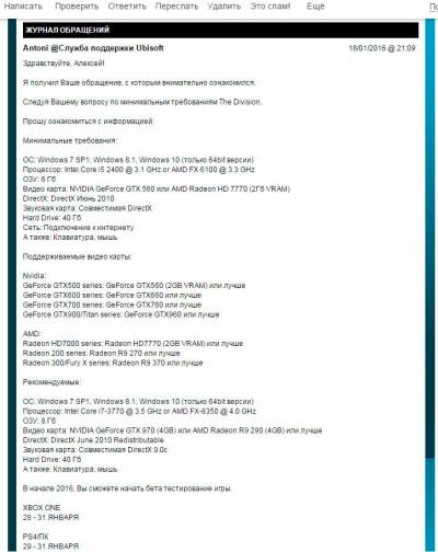 За системные требования игры стоит благодарить российское отделение Ubisoft. Отвечая на вопрос пользователя о минимальных системных требованиях представитель отделения огласил весь список, минимальных и рекомендованных требований The Division. Будем надеяться, что он не сам их придумал.